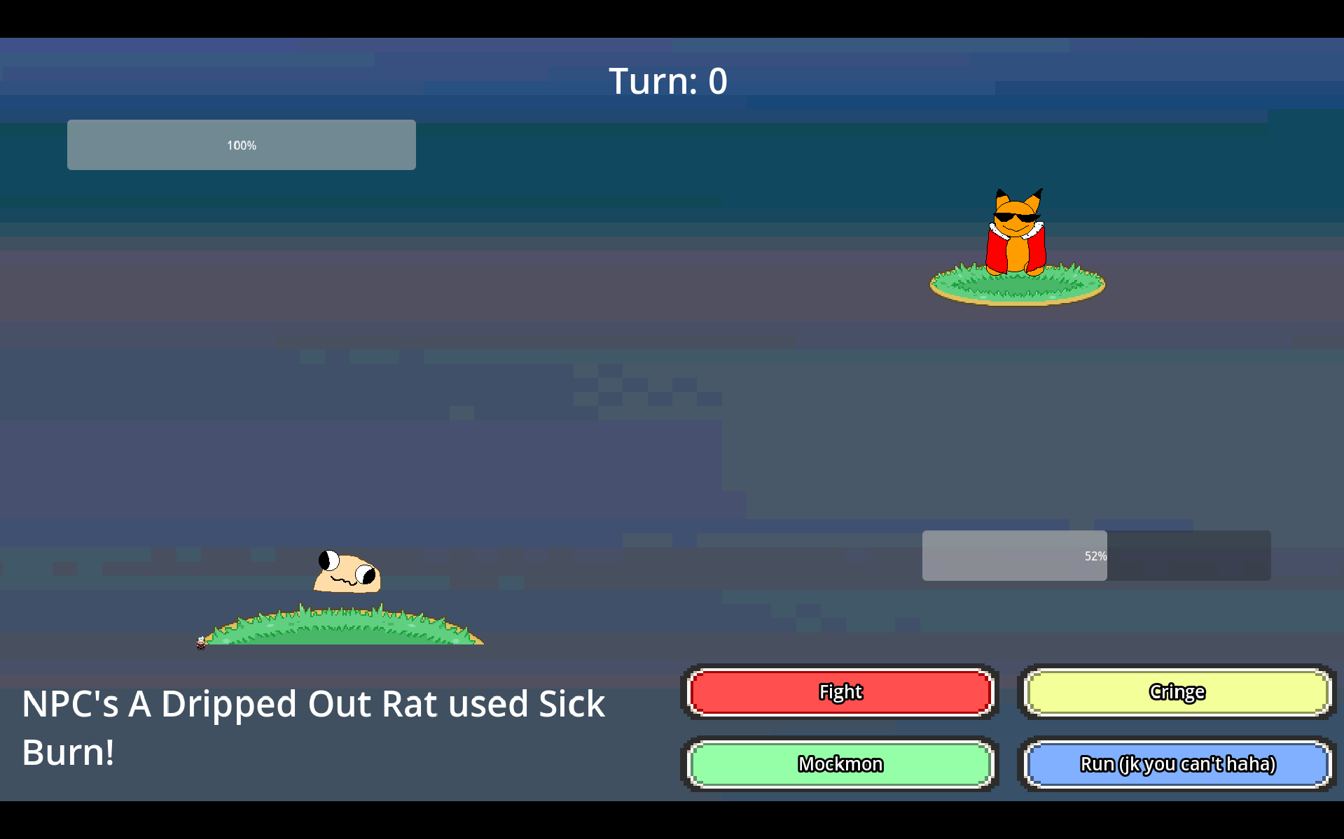 Developed by me and https://github.com/ZerolinZ1. Our fangame takes the player character against a formidable foe with a full team of 6 custom-made Mockmons with their own special moves and typing. You can run around the overworld for as long as you please, but your opponent will be staring right at you, waiting for a fight! And don't wait too long, because your challenger is none other than a corrupted Santa Claus! With his minions by his side, he plans on taking over Halloween and making it a 2nd Christmas, but we definitely can't have that! Challenge him to a 6v6 singles battle that'll have you at the edge of your seat!